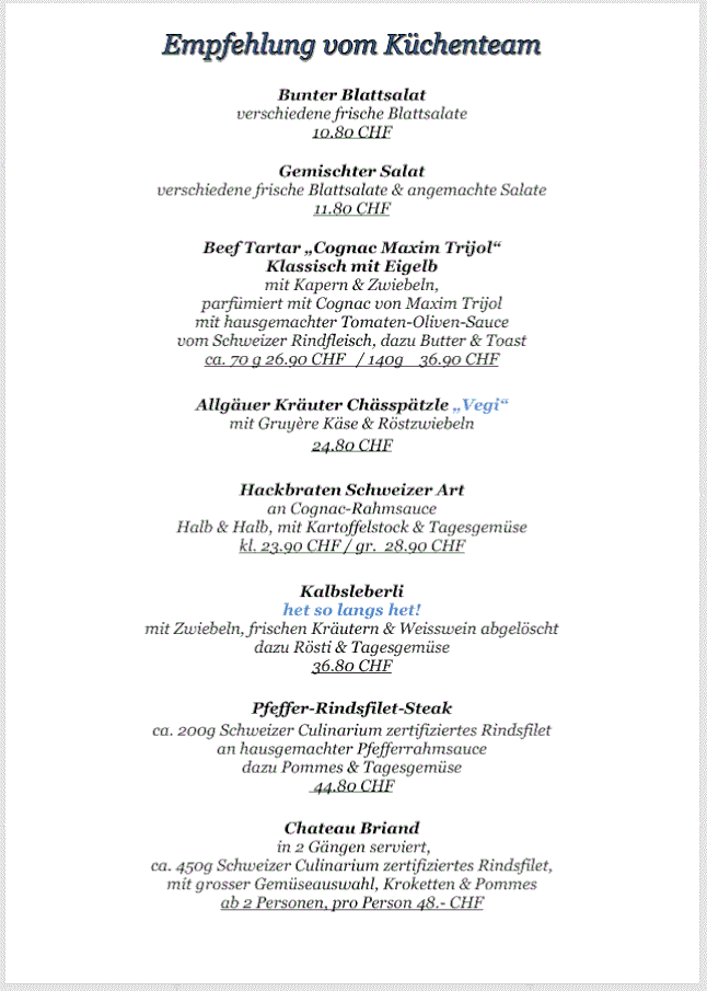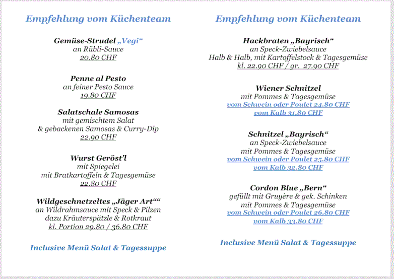 Mittwoch - Freitag Mittagsmenüs von 11.30 Uhr - 14 Uhr